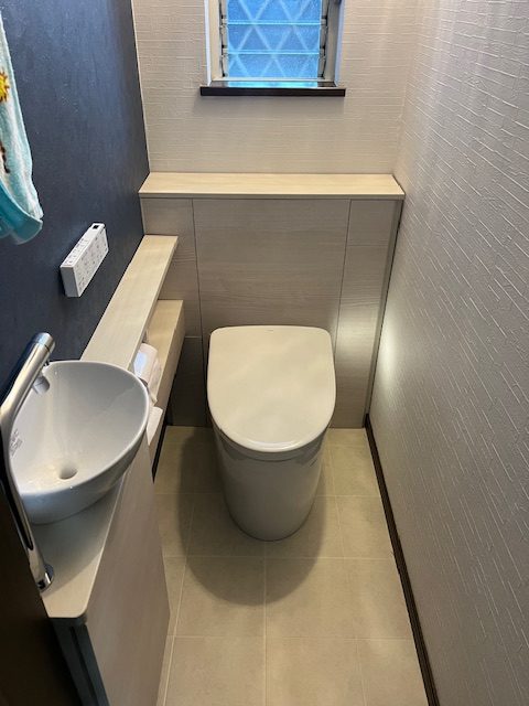 奥様こだわりの1Fトイレは給水排水工事をしなくても、別の手洗器が付けられるものをお選びいただきました。
